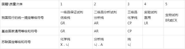 我國化學試劑的等級標志和符號