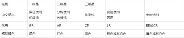 化學試劑在生產(chǎn)時,按用途不同制造出等級不同的規(guī)格,以供各使用單位按實驗要求選用。